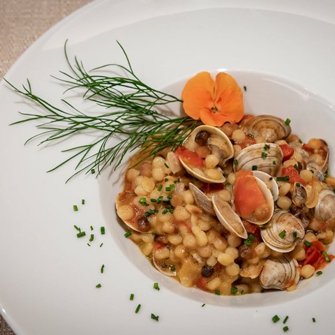 Our repertoire of Mediterranean foods especially includes Italian and traditional Sardinian goodies. Meet popular pasta and rice dishes with fresh vegetables, olives and herbs from our own herbs garden, garnished with finely grated Sardinian pecorino (sheep milk cheese), specialties such as squid carpaccio with bottarga (cured fish roe), various pasta dishes with Sardinian pasta type fregola, swordfish carpaccio, zuppa gallurese (bread casserole with pecorino and mint), Sardinian gnocchetti named malloreddus, pane carasau – typical thin bread shepherds’ bread, boar dishes …