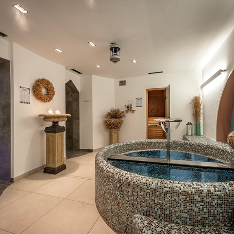 Our sauna area awaits you with a fragrant Swiss stone pine sauna (80°C), a new Turkish steam bath with rose quartz (ca. 45°C), a infrared cabin (35°C) and a new Finnish garden sauna in acacia wood (85°C) where you can sweat all your stress out. Taking a sauna isn’t just beneficial for body and skin, but also for the soul! To cool down, have a cold shower or go for a walk in the Kneipp basin – an absolute must-do when doing wellness in South Tyrol!