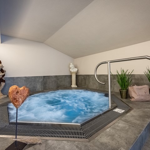 Rilassarsi, sognare e far vagare la propria mente – una vacanza per tutti i sensi! L’acqua della nostra piscina coperta vi avvolge con piacevoli 28°C. Fate le vasche o lasciatevi galleggiare nell’acqua. Dopo il bagno conviene accomodarsi su una soffice poltrona o su una sdraio davanti alla vasca o fuori in giardino, all’aria fresca. Sul nostro prato con lettini singoli e matrimoniali a baldacchino molto accoglienti, potete fare il pieno di Vitamina D ed energia. Rinfrescatevi con l’acqua fresca di montagna che esce dalla fontana di marmo sardo del circuito Kneipp.